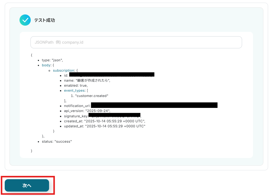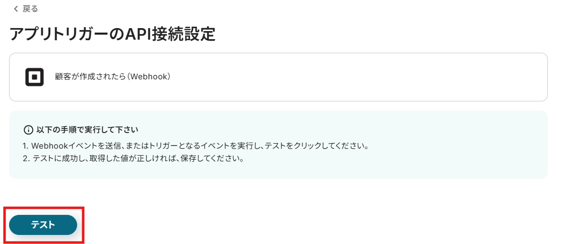 顧客を作成したらYoomの操作画面に戻り、テストを実行します。