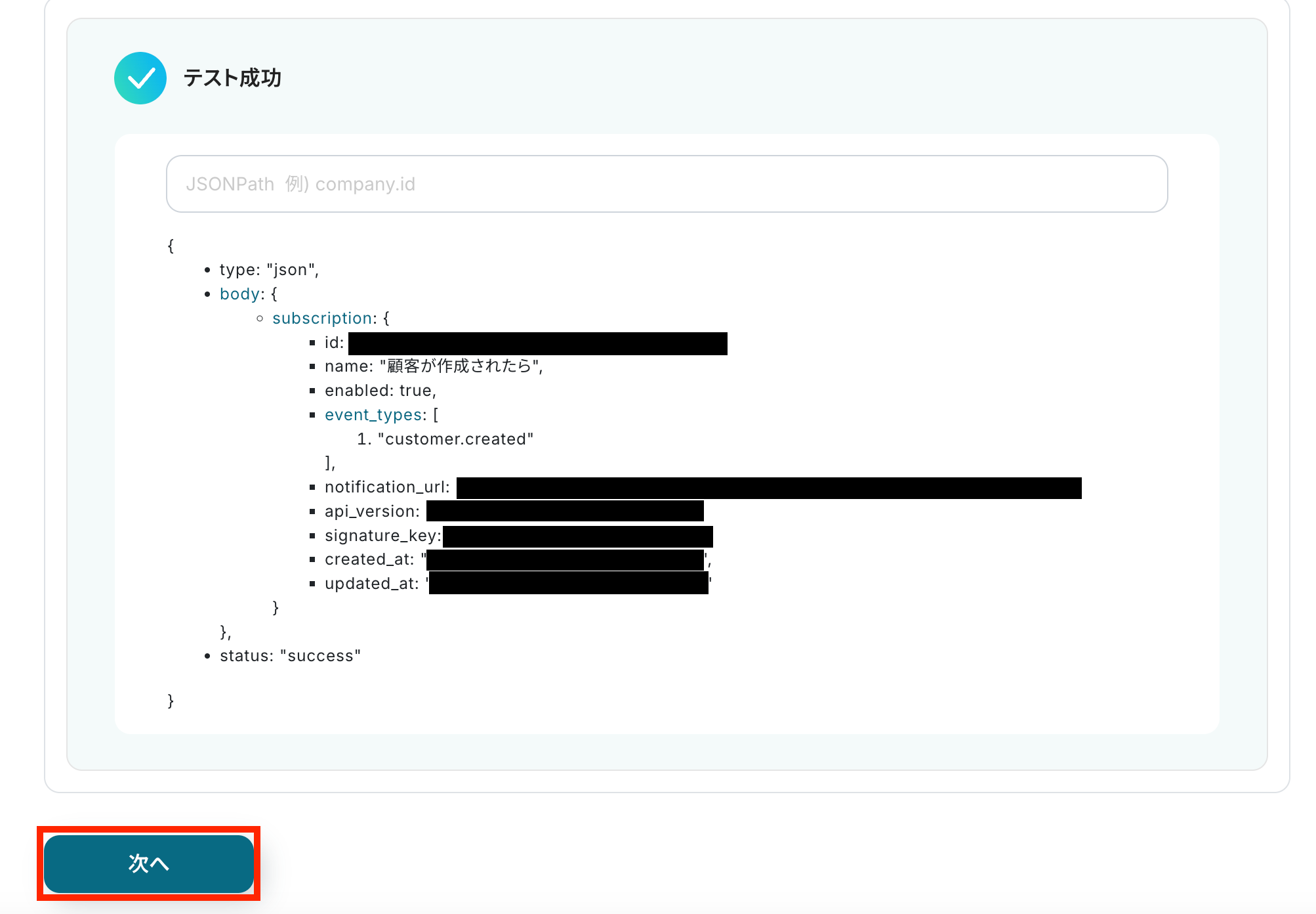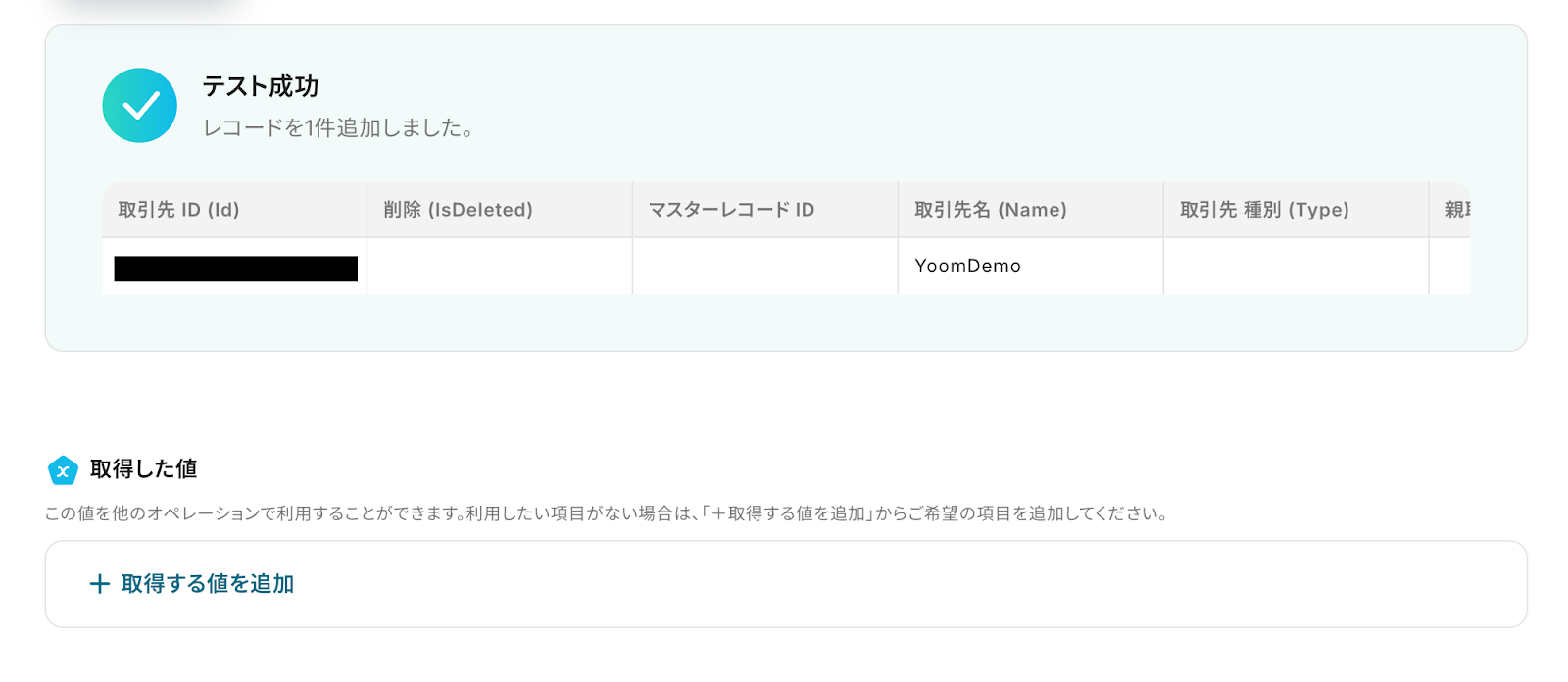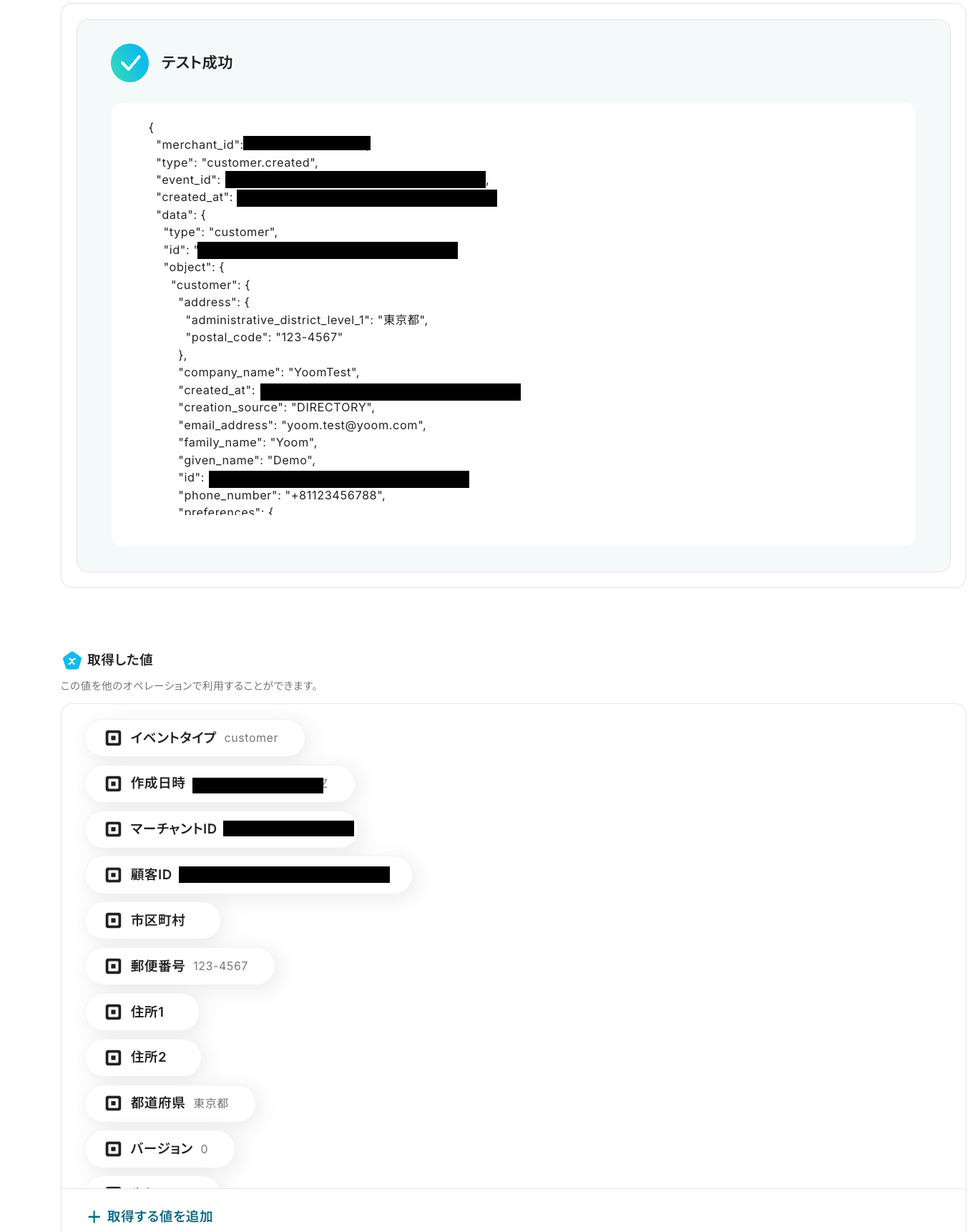 「テスト成功」と表示が出たら、取得した値が取得されます。
