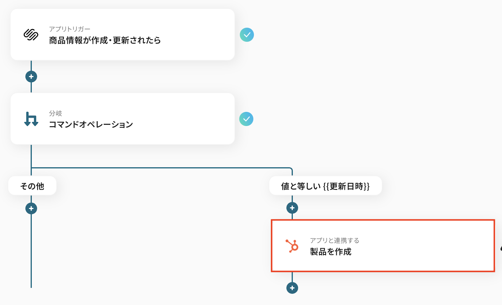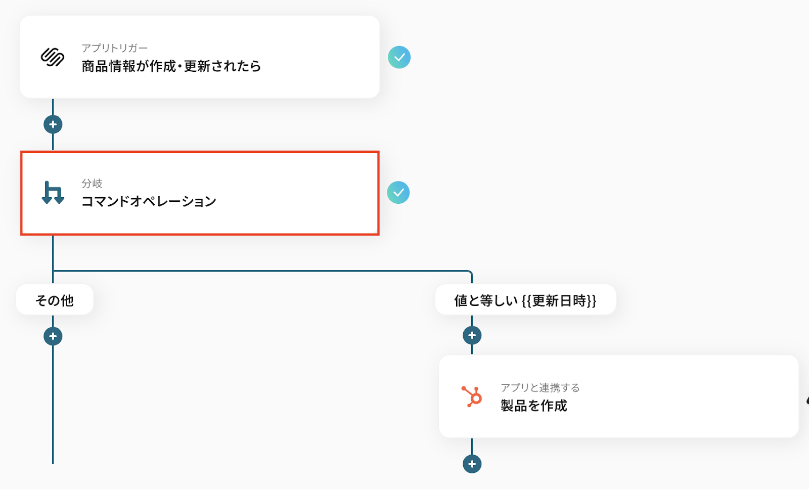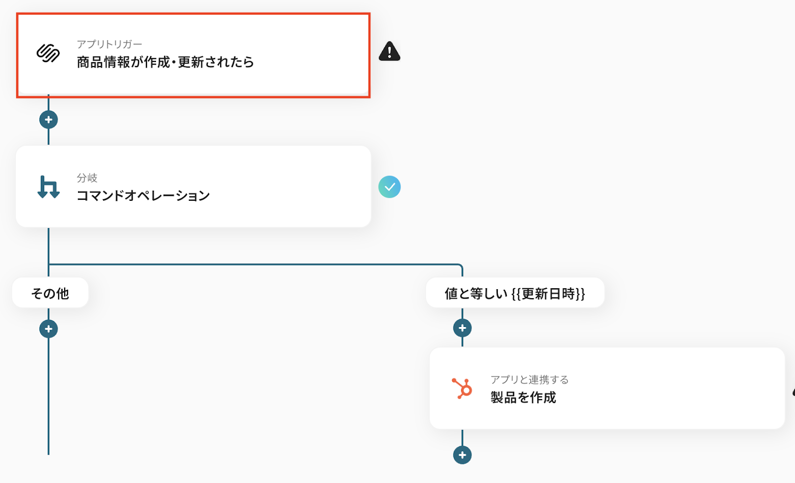 このテンプレートを使えば、特定の条件を満たす製品がHubSpotで作成された場合にのみ、Squarespaceに商品を作成するといった分岐処理を自動で行えるため、柔軟な商品管理が実現します。