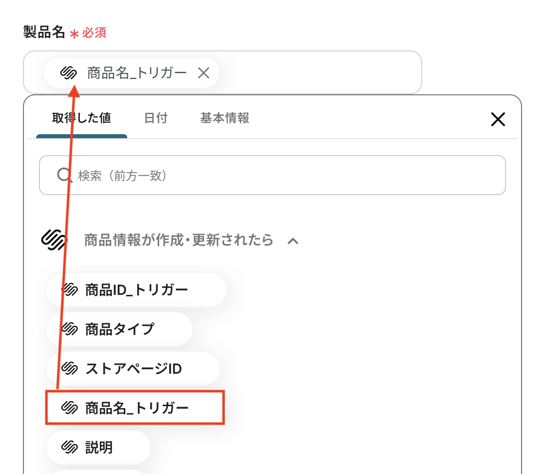 Squarespaceで商品情報が作成されたタイミングをトリガーとして、処理を開始するように設定されています。