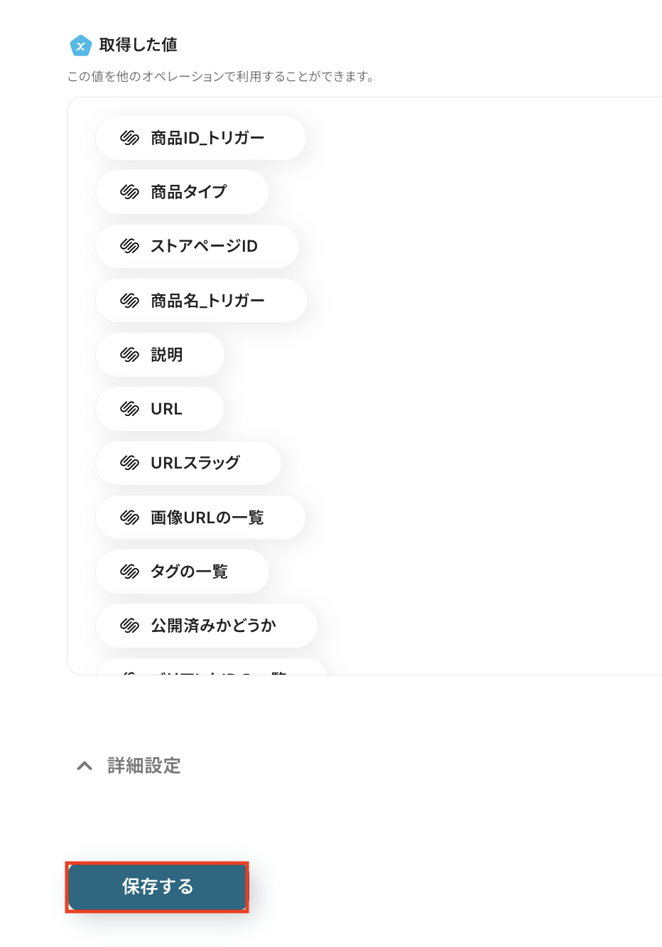 以下の画像の取得した値(=アウトプット)は、後続のステップで使用可能です。