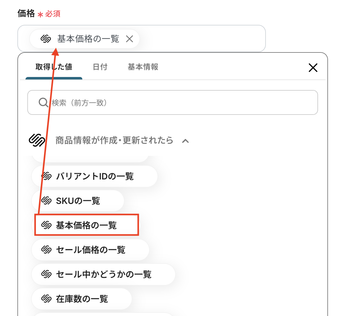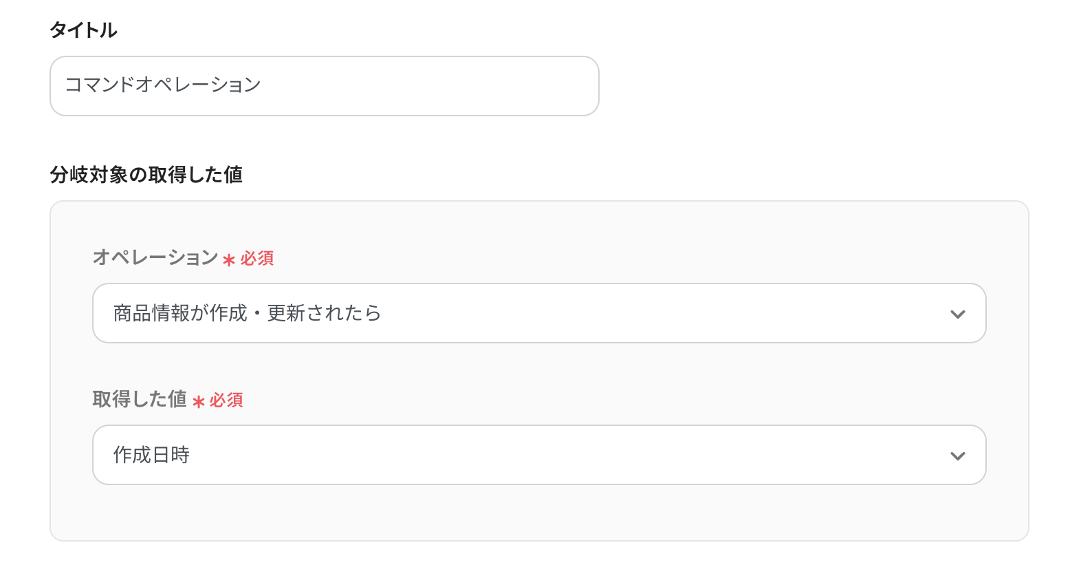 今回のテンプレートでは「新規作成のみ」の分岐がデフォルトで設定されていますが、例えば「商品情報が更新されたら」や「商品IDを指定」といったように、複数条件を組み合わせた分岐設定も行えます。