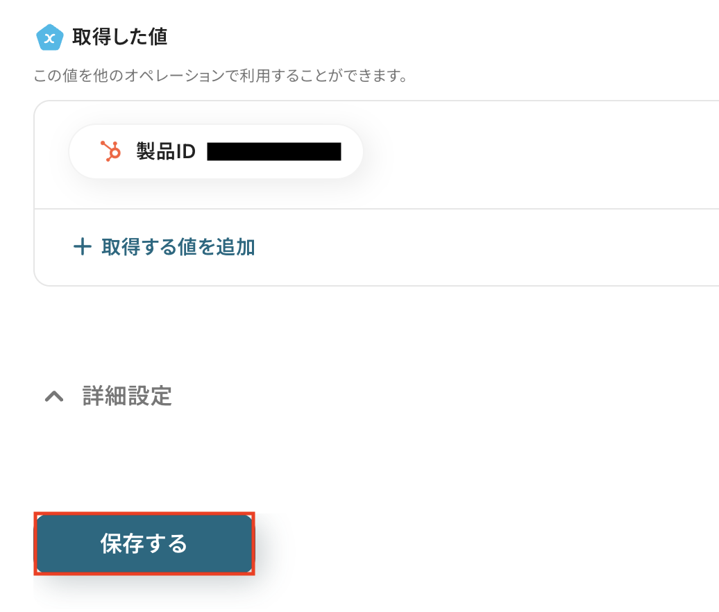 HubSpotに製品を作成する際、製品名や価格といった必須項目に加えて、説明、SKU、単位コストなど、Squarespaceのトリガーイベントで取得した商品情報に含まれる詳細な項目も任意でマッピングし、製品作成時に反映させることができます。