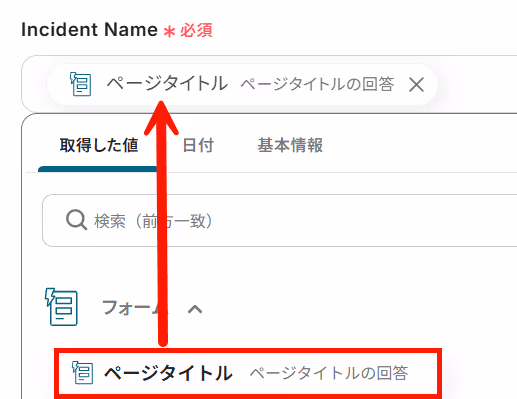 Incident Nameは前項で取得した値から「ページタイトル」を選択しましょう。