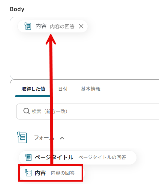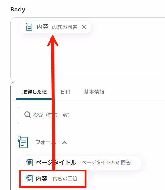 同様にBodyにも、前項で取得した値から「内容」を選択します。
