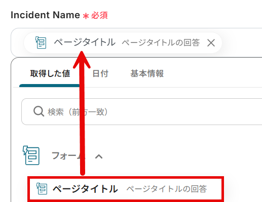 Incident Nameは前項で取得した値から「ページタイトル」を選択しましょう。 取得した値を使用することで、値が固定化されずトリガーが実行されるたびに新しい情報が反映されます。