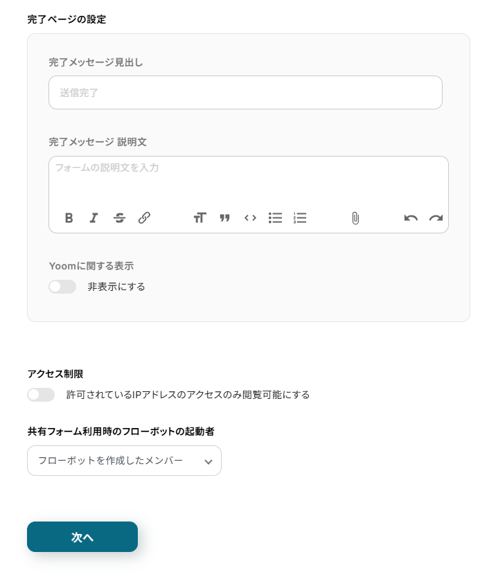 有料プランの場合のみ、回答後の完了ページの設定やアクセス制限についても設定可能です。 任意で設定し、「次へ」をクリックします。