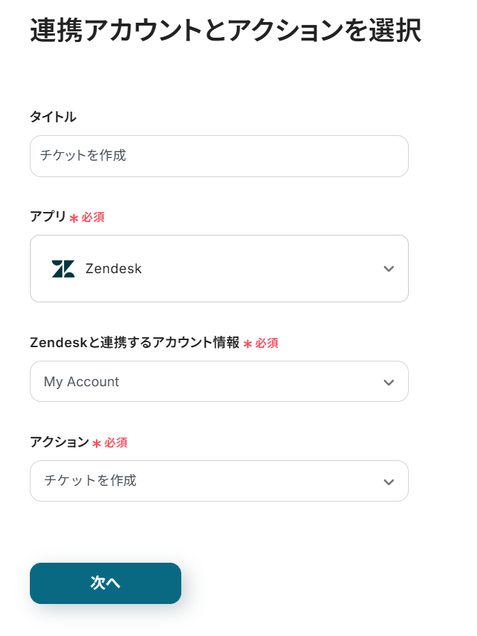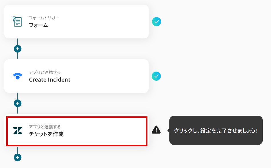 次に3つ目の工程をクリックします。 Zendeskにチケットを作成するを設定しましょう。