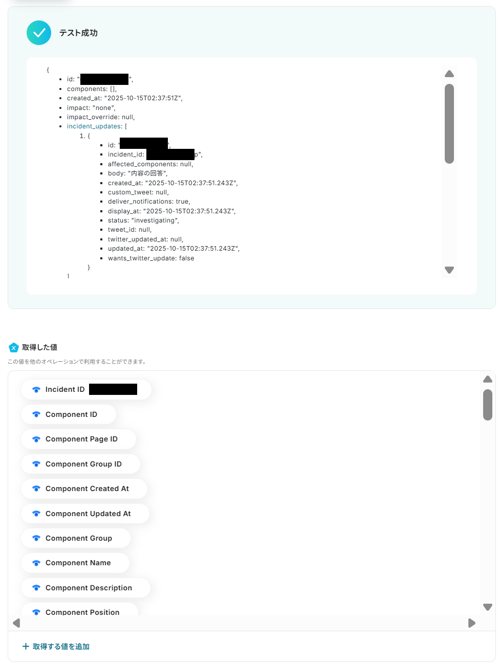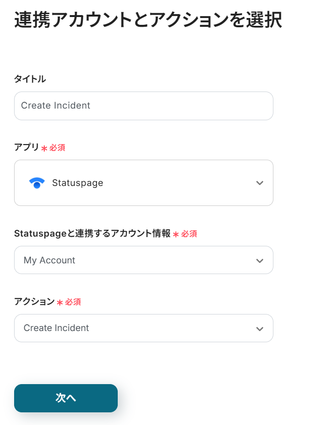 アクション:トリガーが起動したら、StatuspageにIncidentを作成します。