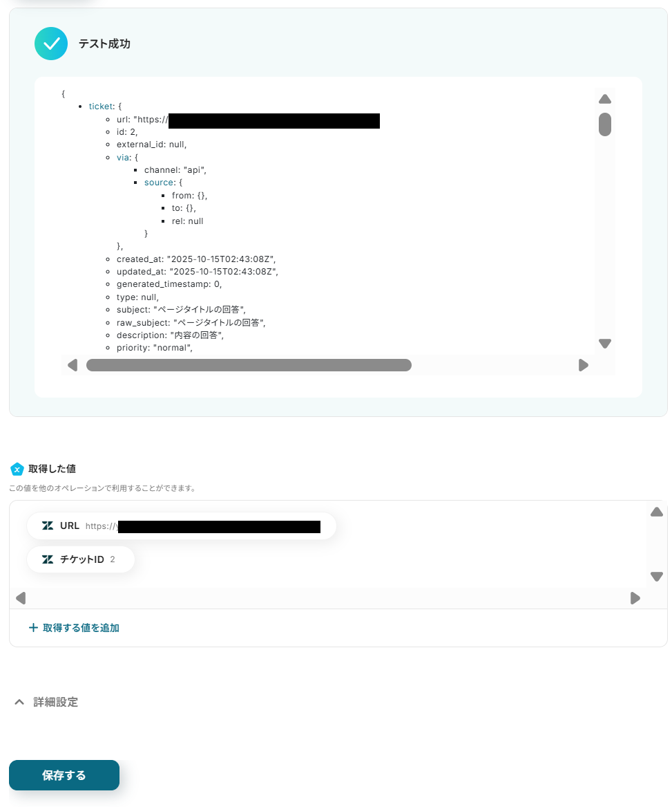 テストに成功すると以下のように表示され、Zendeskにチケットが作成されていますね! 確認し「保存する」をクリックしてください。