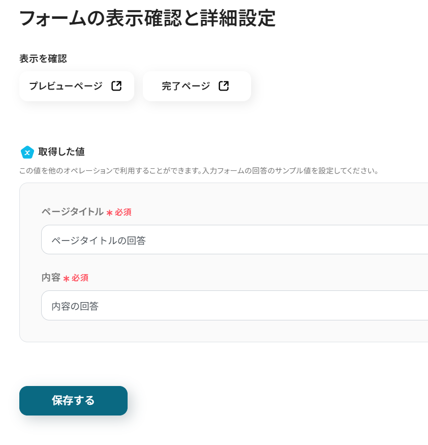 ここで、テスト用に取得した値に仮の回答を設定し「保存する」をクリックしましょう。 ※ここで入力したサンプル値は、フローの運用時に影響しません。 運用時は、実際の回答内容が抽出されます。