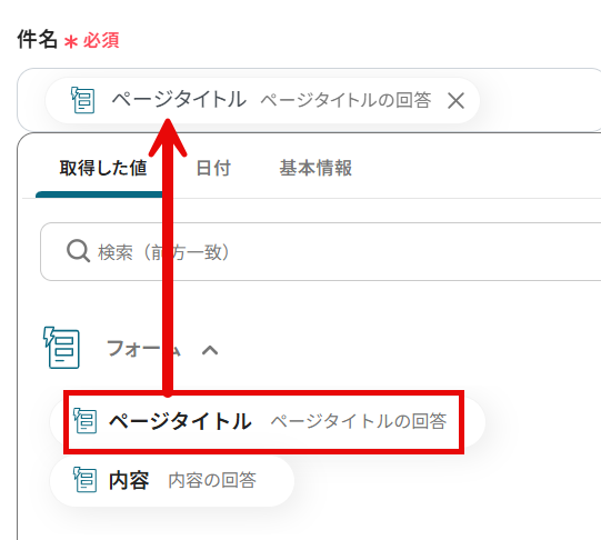 件名は、前項で取得した値から「ページタイトル」を選択します。 取得した値を使用することで、値が固定化されずトリガーが実行されるたびに新しい情報が反映されます。