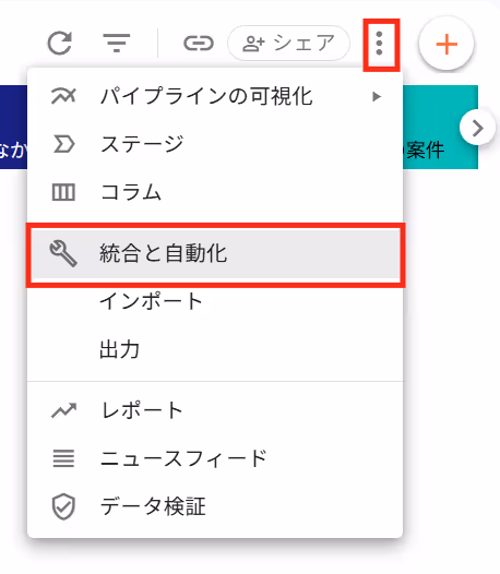 GmailでStreakを開き、パイプライン画面の「設定」横にある縦の三点アイコンをクリックし、「統合と自動化」を選択してください。
