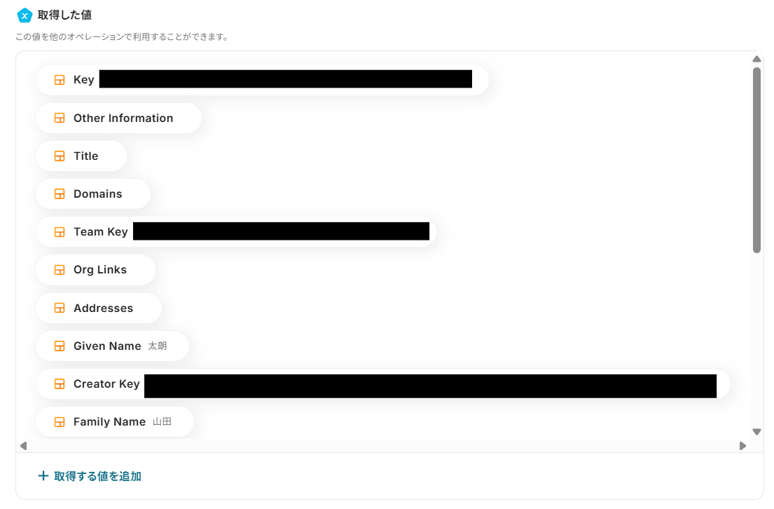 テストが成功すると、取得した値の横に、Streakに追加したコンタクトの詳細情報(アウトプット)が表示されます。