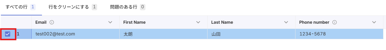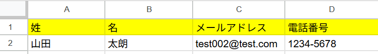 Googleスプレッドシート、Microsoft Excel、またはCSV形式でファイルを作成し、1行目にヘッダー、2行目に対応するコンタクト情報を入力してください。