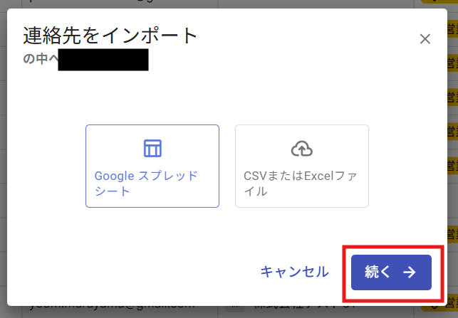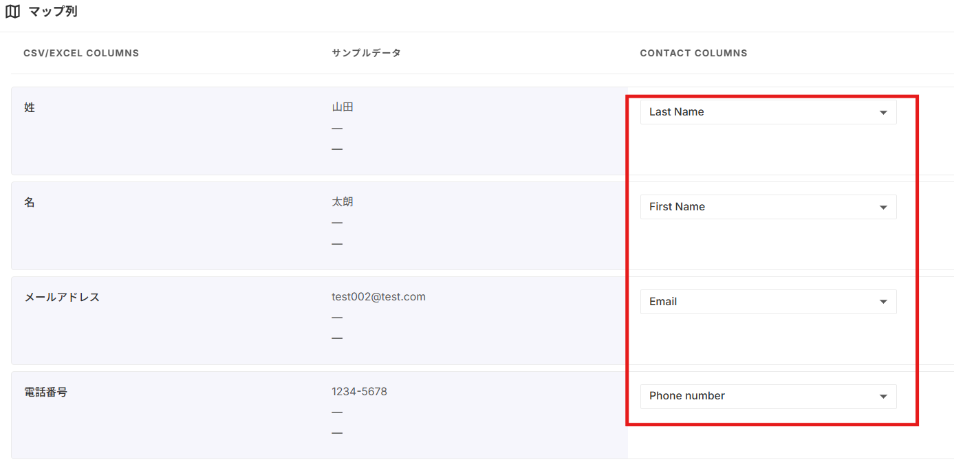 追加する情報を赤枠内で選択し、マッピング先が正しいか確認したら「インポート」をクリックしてください。