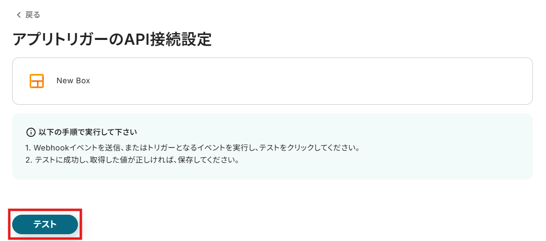StreakにBoxを作成したら、Yoomの操作画面に戻り「テスト」をクリックします。