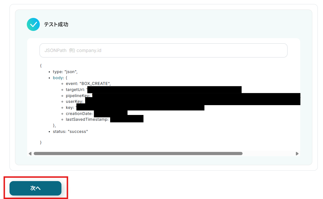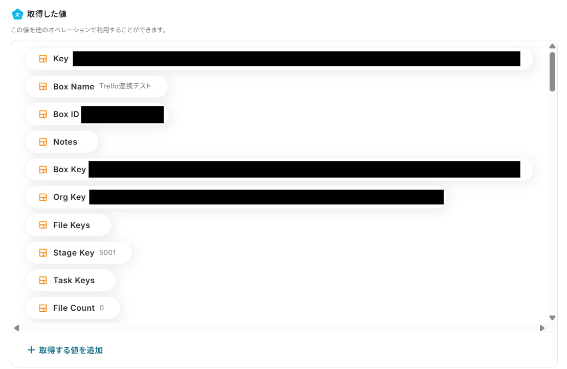 テストが成功すると、取得した値の横に、Streakで作成したBoxの詳細情報(アウトプット)が表示されます。