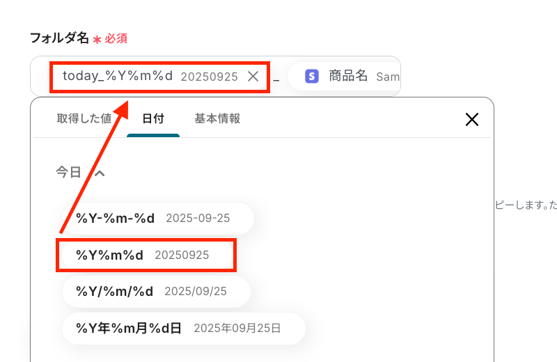 たとえば、「今日_商品名」と日付を入れたり、「商品ID_商品名_フォルダ」などと設定できますよ!