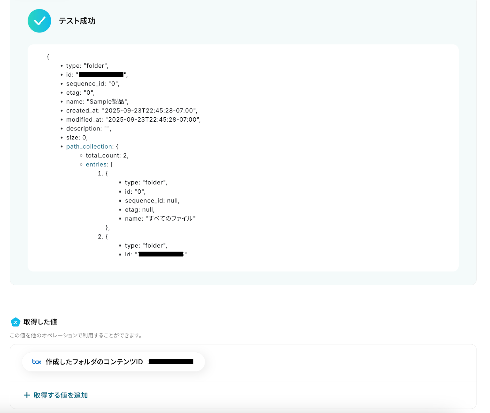 テストを成功させることで「取得した値」が取得でき、前述したように後続のオペレーション設定時に活用できます。詳しくはこちらをご覧ください。