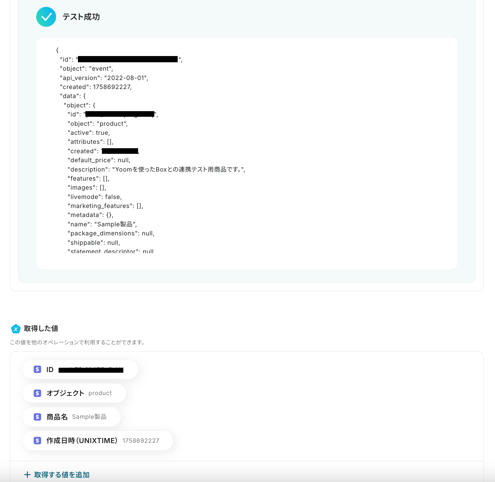 テストが成功すると、先ほど作成した商品の情報が「取得した値」にアウトプットとして抽出されるので、内容を確認しましょう。