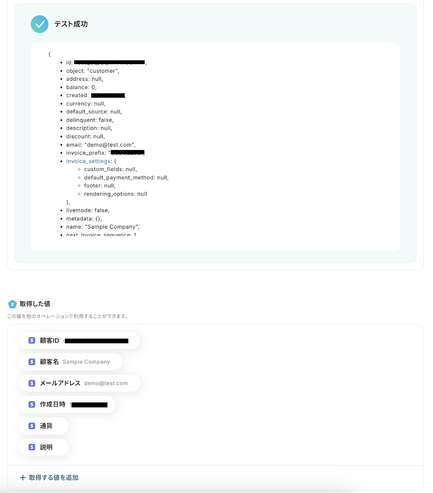 テストが成功すると、先ほど作成した顧客情報が「取得した値」にアウトプットとして抽出されるので、内容を確認しましょう。