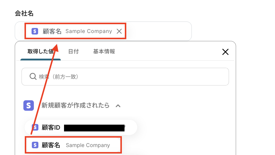 ここでは、入力欄をクリックして表示される「取得した値」の「新規顧客が作成されたら」内にあるアウトプットを使って、各項目に適切な値を設定していきます。