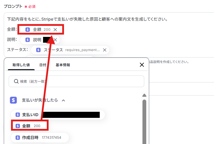 Stripeの「商品を作成する」アクションにおいて、BASEから取得したどの情報をStripeの「商品名」として設定するかを任意でカスタマイズしてください。 同様に、Stripeの「商品説明」についても、BASEのどの情報を利用するか、または固定のテキスト情報をどのように含めるかを設定できます。 ■注意事項