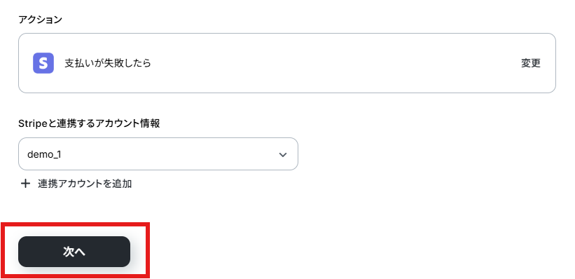 まずはこのフローボットでトリガーになっている、Stripeの「支払いが失敗したら」を設定していきましょう。