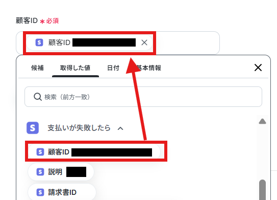 「顧客ID」はデフォルトで以下のように設定されていますので、そのまま使用しましょう。【Tips】 取得した値を活用することで、フローボットを起動する度に変動した値となります。 これにより、毎回変動する情報を手動で入力する必要がなくなり、効率的に連携できます!