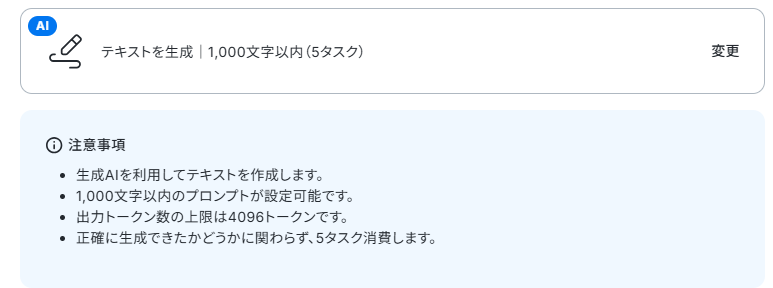 AI機能でテキストを生成するアクションでは、どのような観点でテキストを整理し、どういった形式で解決策のドラフトを作成させたいか、業務内容に合わせた任意のプロンプト(指示)を設定してください。 ■注意事項