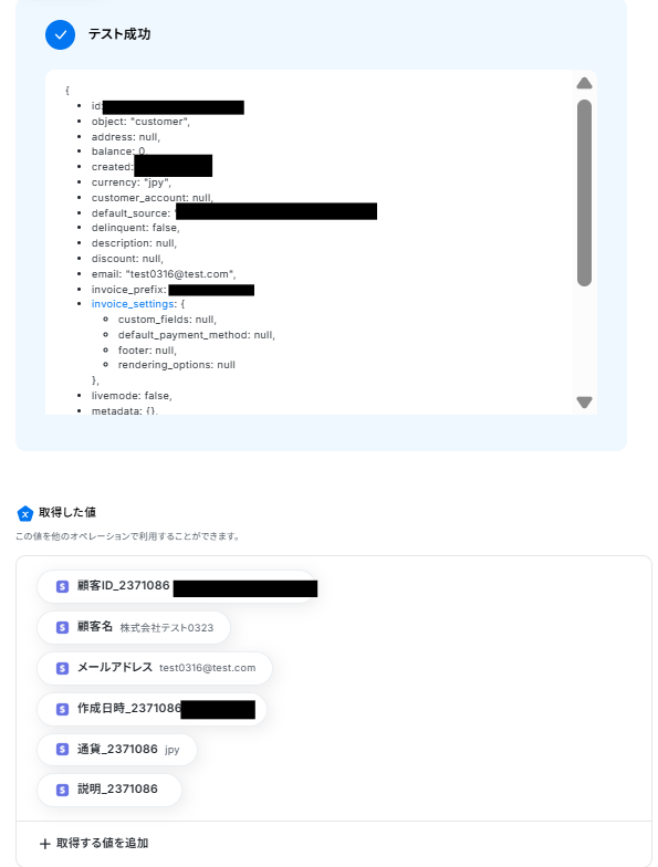 テストボタンをクリックしましょう。 テストが成功し、取得した値に顧客情報が入ればOKです。