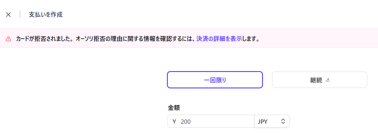 次に、画面注釈通り「Webhookイベントを送信、またはトリガーとなるイベントを実行」しましょう。 今回は「支払が失敗したら」なので、支払いの試行が失敗するようにしました。 ※Stripeの ドキュメント で提供されている特定のテストカード番号を使用することで、様々な種類の支払い失敗をシミュレーションできます。