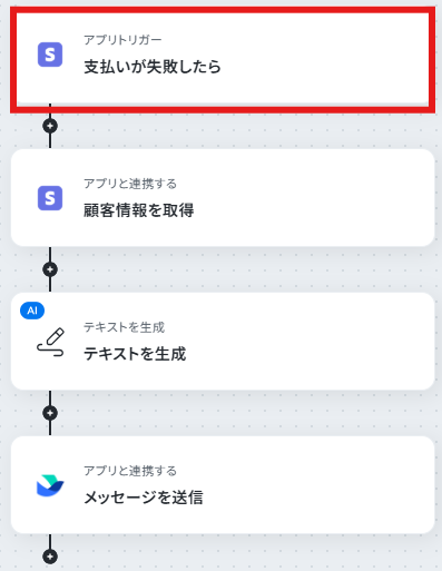 「Stripeで支払いが失敗したら、AIで原因と対策を整理してLarkに通知する」 フローを作成していきます!