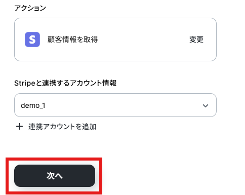 ステップ4:Stripeの顧客情報を取得する 次に前ステップで支払に失敗した顧客情報を取得します。「顧客情報を取得」をクリックしてください。