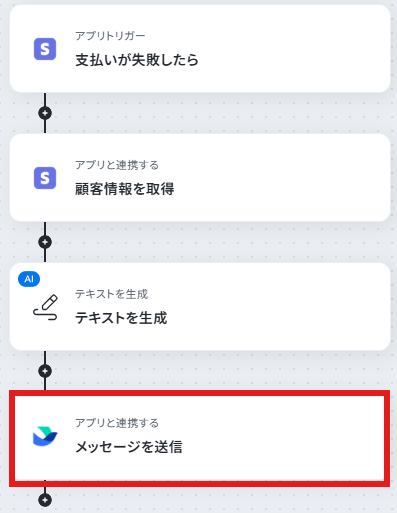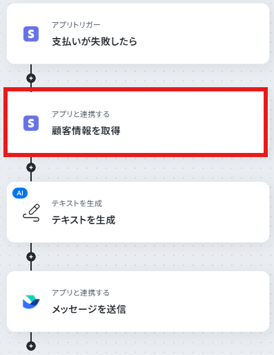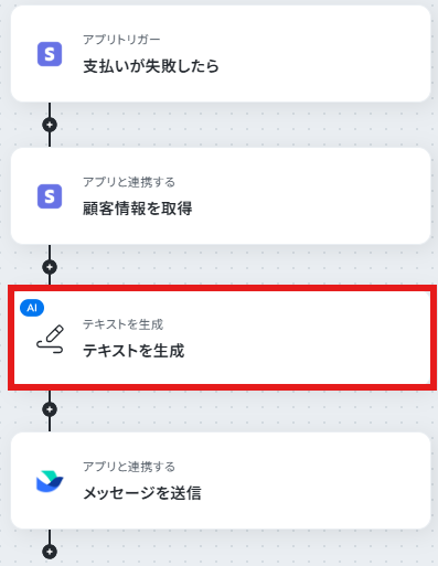 はじめに、StripeとLarkをYoomと連携します 次に、トリガーでStripeを選択し、「支払いが失敗したら」というアクションを設定します 次に、オペレーションでStripeの「顧客情報を取得」アクションを設定し、支払い失敗に関連する顧客情報を取得します 次に、AI機能を用いて、取得した情報から支払い失敗の原因と対策案を整理するための指示を作成します 最後に、オペレーションでLarkの「メッセージを送信」アクションを設定し、AIが生成したテキストを指定のチャットに通知します ※「トリガー」:フロー起動のきっかけとなるアクション、「オペレーション」:トリガー起動後、フロー内で処理を行うアクション■このワークフローのカスタムポイント