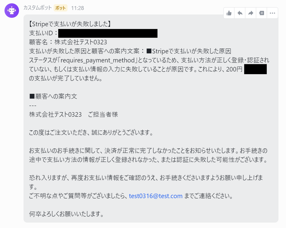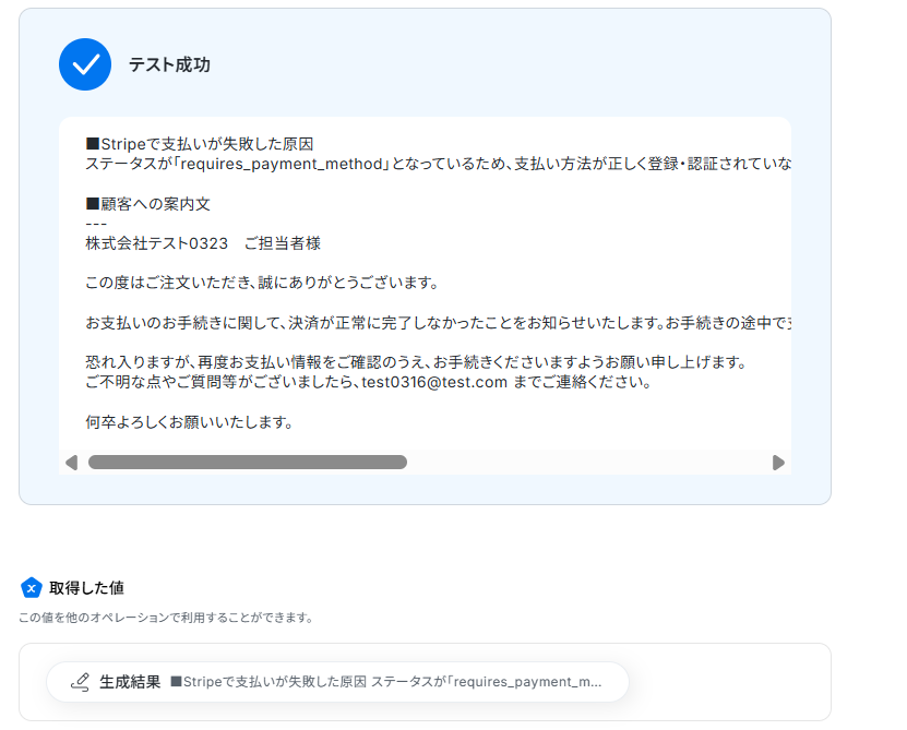 テストボタンをクリックしましょう。 テストが成功し、顧客への案内文が生成されればOKです。