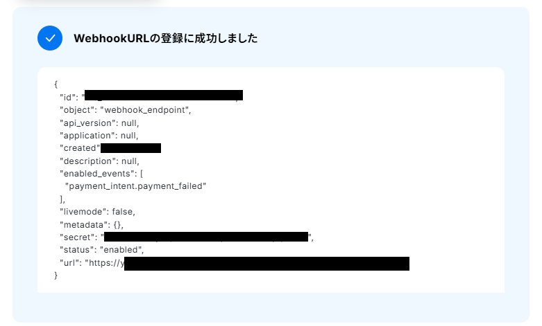 Webhookを登録します。画面注釈を読み「WebhookURLを登録」をクリックしてください。 以下のようにWebhookURLが登録されればOKです。「次へ」ボタンを押して先に進みましょう。