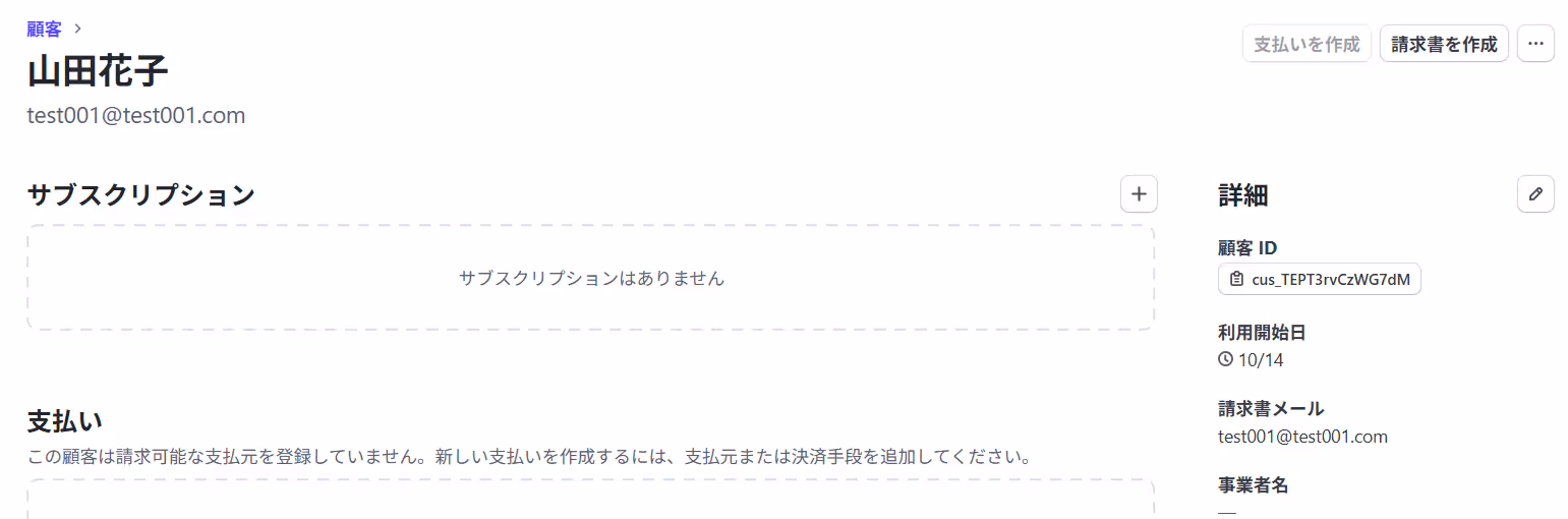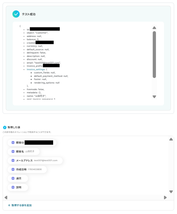 テストが成功すると、取得した値の各項目の横にStripeで作成した新規顧客の詳細情報が表示されます。