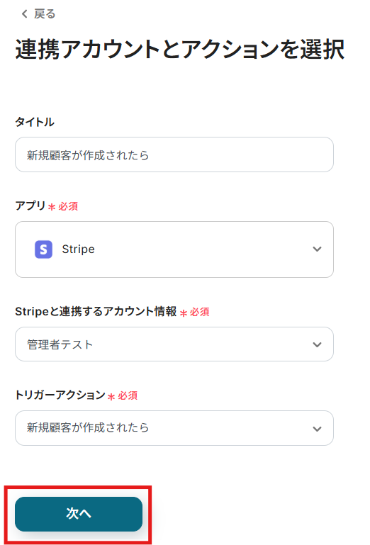トリガーアクションは、「新規顧客が作成されたら」のままで次に進みましょう!