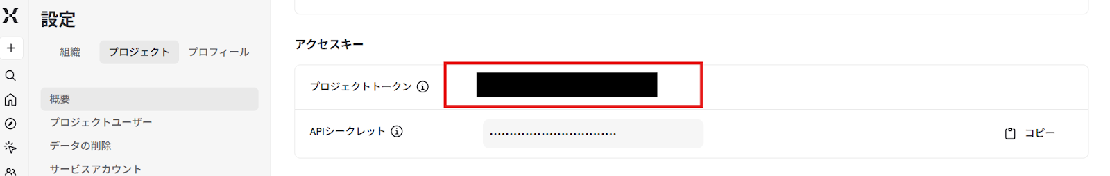 「設定」→「Project Settings」に進み、「アクセスキー」セクションから連携したいプロジェクトのプロジェクトトークンをコピーしてください。
