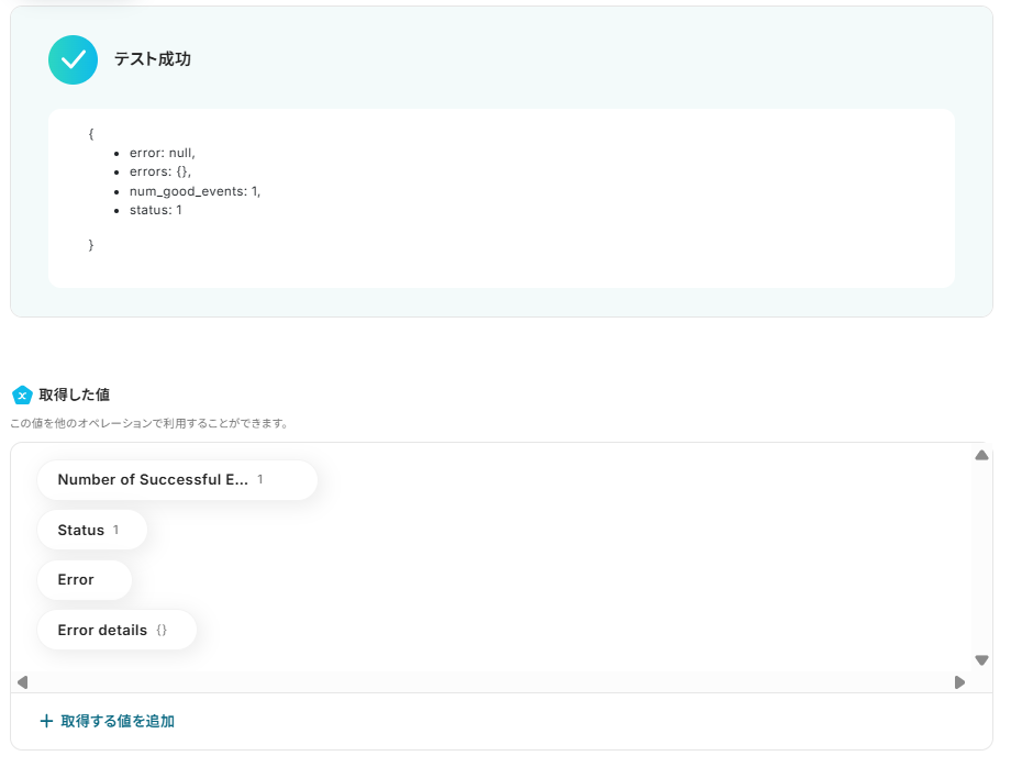 Stripeと同様に、ステップ1でマイアプリ連携したMixpanelのアカウント情報が自動で表示されます。