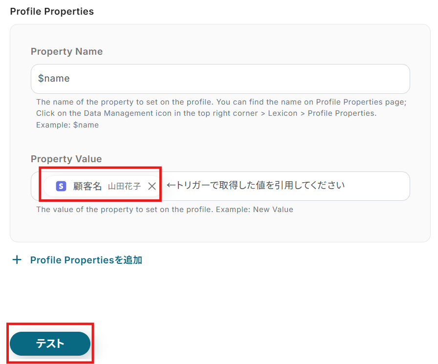 デフォルトで入力されている「←トリガーで取得した値を引用してください」を削除して、テストを実行してください。