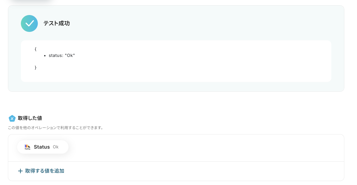 テストを成功させることで「取得した値」が取得でき、前述したように後続のオペレーション設定時に活用できます。