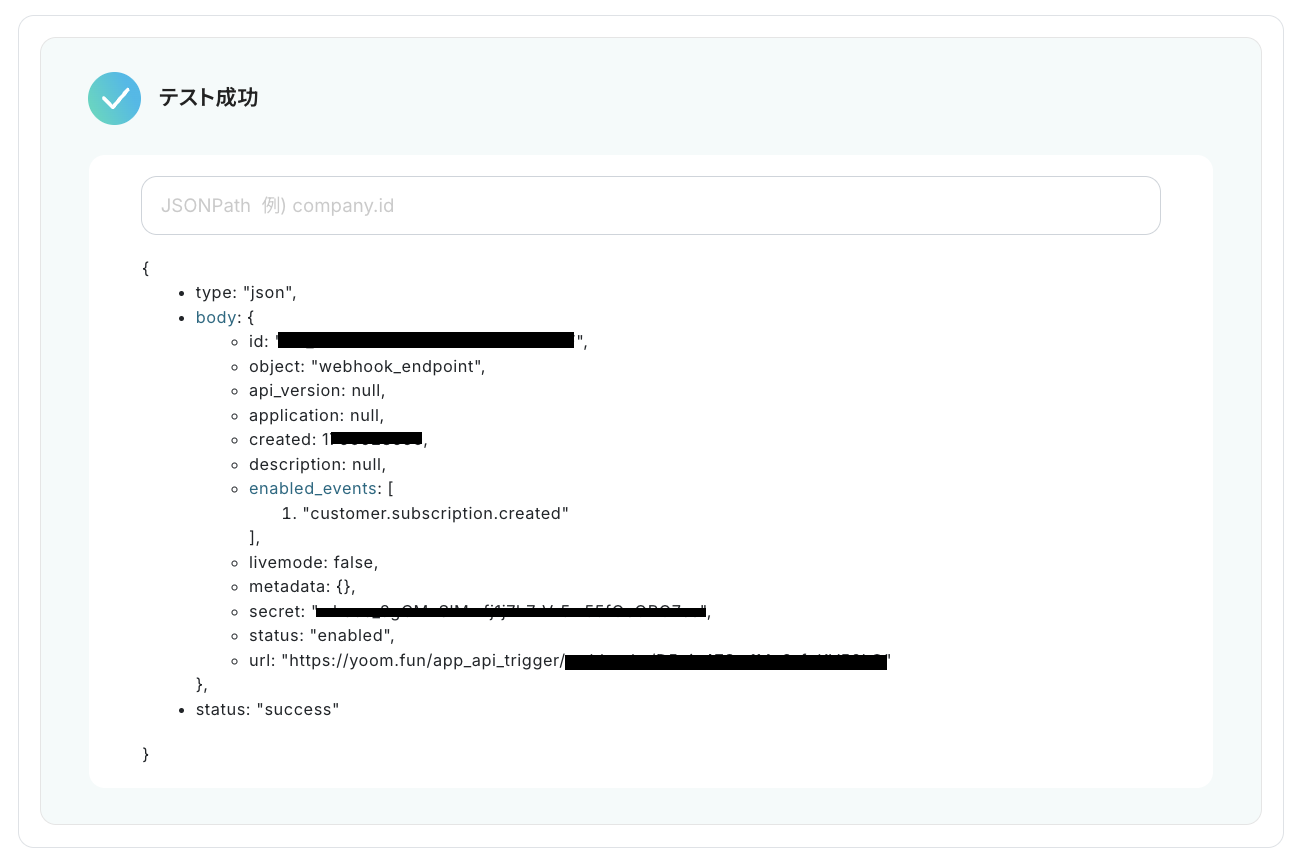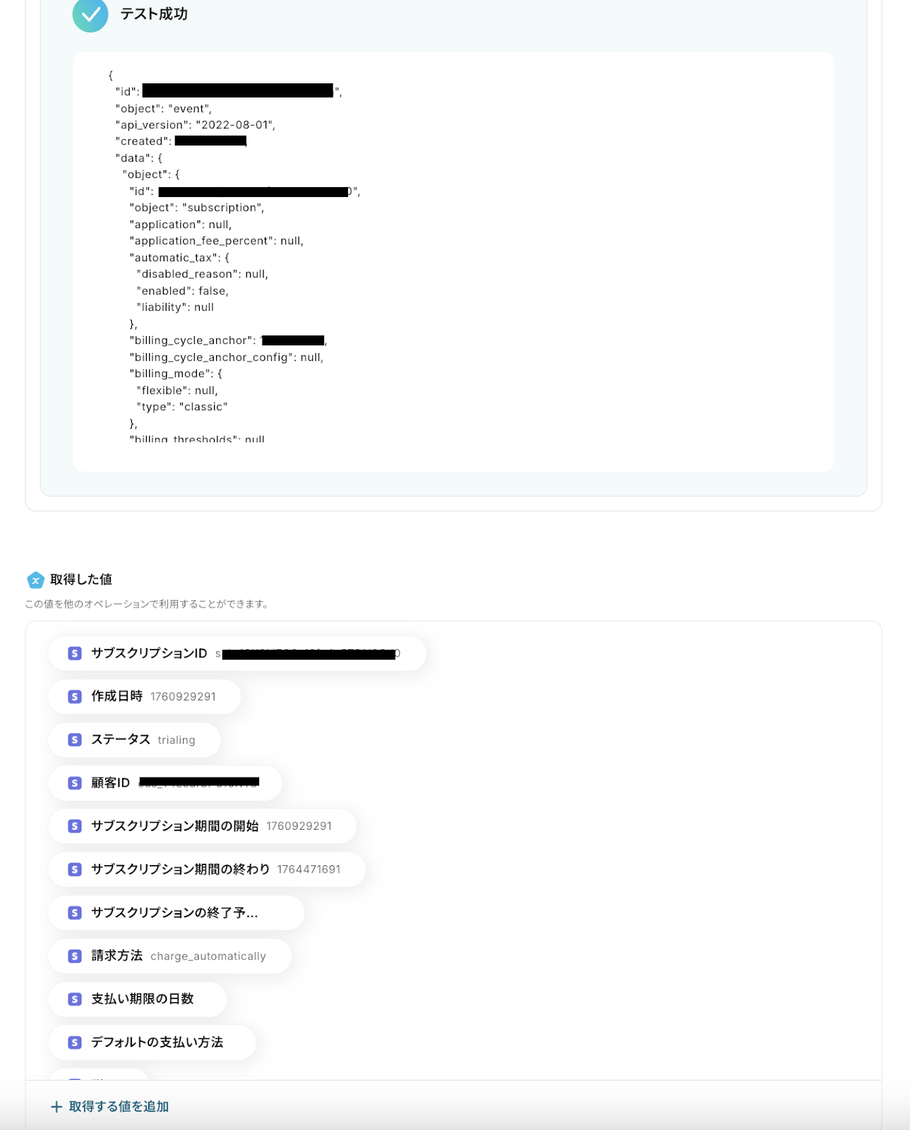 テストが成功すると、先ほど完了したサブスクリプションプランの申込情報が「取得した値」に抽出されるので、内容を確認しましょう。