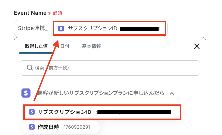 Event Name:手入力による固定値や、Stripeから「取得した値」を活用して、お好みで設定しましょう。