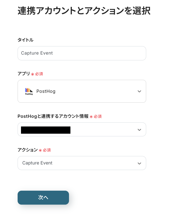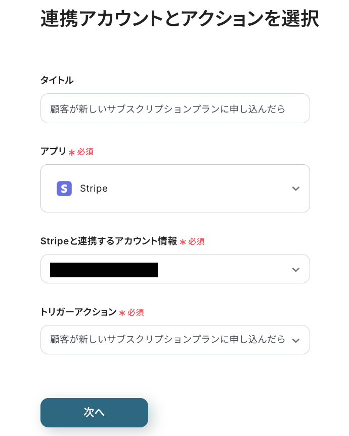 「連携アカウントとアクションを選択」の設定内容はステップ3と同じ要領で確認し、アクションは変更せずに「次へ」を押してください。