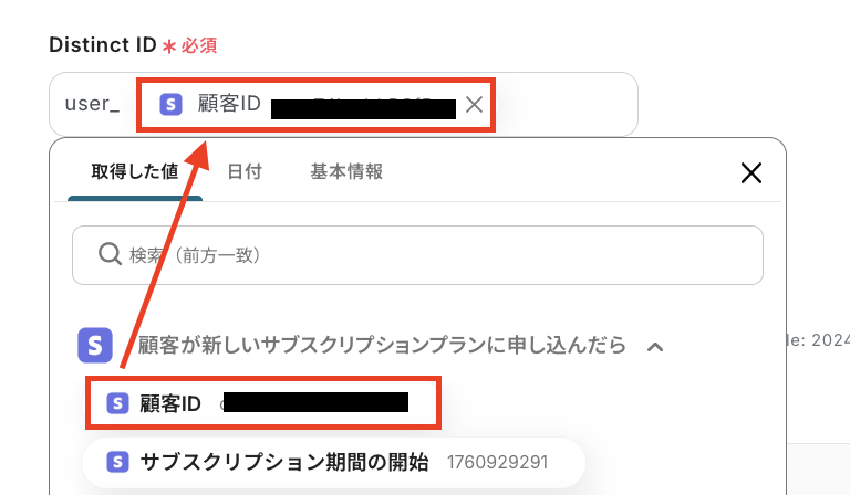 Distinct ID:こちらも同様に、手入力による固定値とStripeから「取得した値」を組み合わせて設定してみてくださいね!