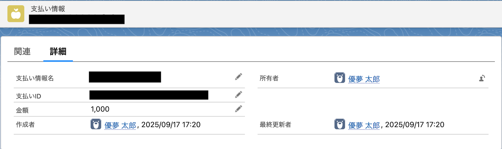 記事内の連携テストで使用した「支払いID」や「金額」のほか、作成日時、通貨、ステータスなどの基本情報をSalesforceに登録できます。