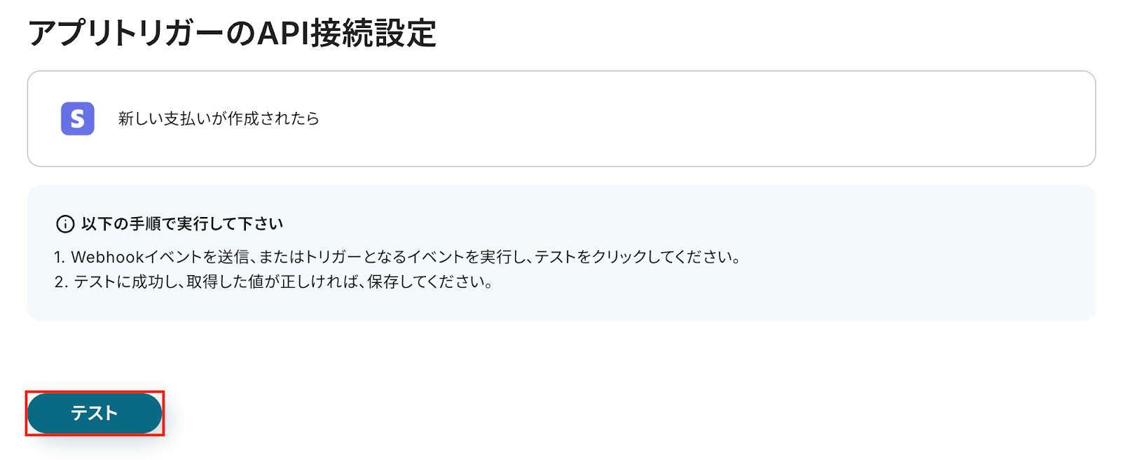 「テスト」をクリックして、YoomがStripeからWebhookを正しく受け取れるか確認しましょう。